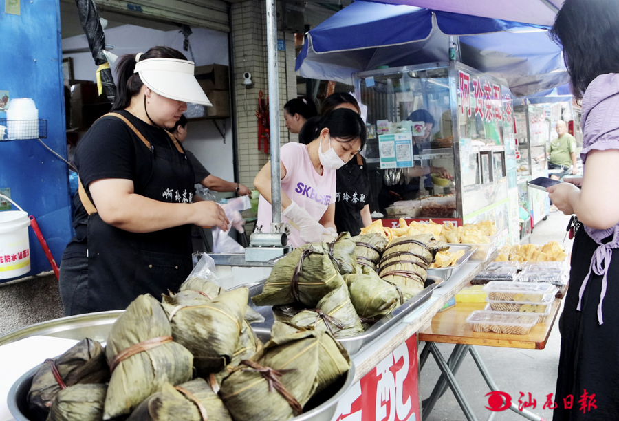 端午至,汕尾大街小巷彌漫著濃濃粽香。連日來,在繁忙的街邊小店,新鮮出爐的粽子堆成小山,種類豐富,吸引不少市民選購。小小的粽子承載著汕尾人的情感記憶,也傳遞著節日的溫暖和祝福。圖為市民購買粽子。