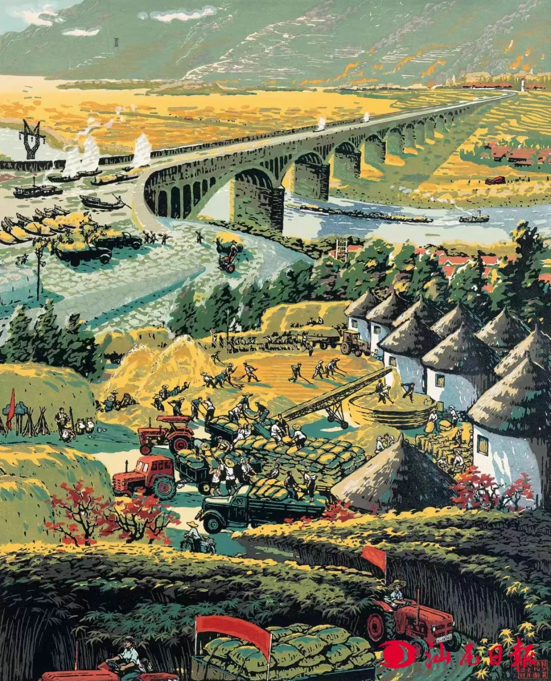 《舟山漁村》筆畫簡約勾勒出口岸熱鬧的景象:在遠處山上依稀可見一小片樹林,下面房屋連片——都是兩三層的小樓房。近處有幾艘漁船靠在岸邊,大概漁民捕魚歸來了。遠處還有四五艘漁船漸漸駛出岸邊,貌似要出海捕魚……從中可見:小小的漁村已改頭換面!漁民靠海吃海,在好政策的支持下,發揮自己的聰明才智打魚、賣魚,經濟好了,住上了“小洋房”!