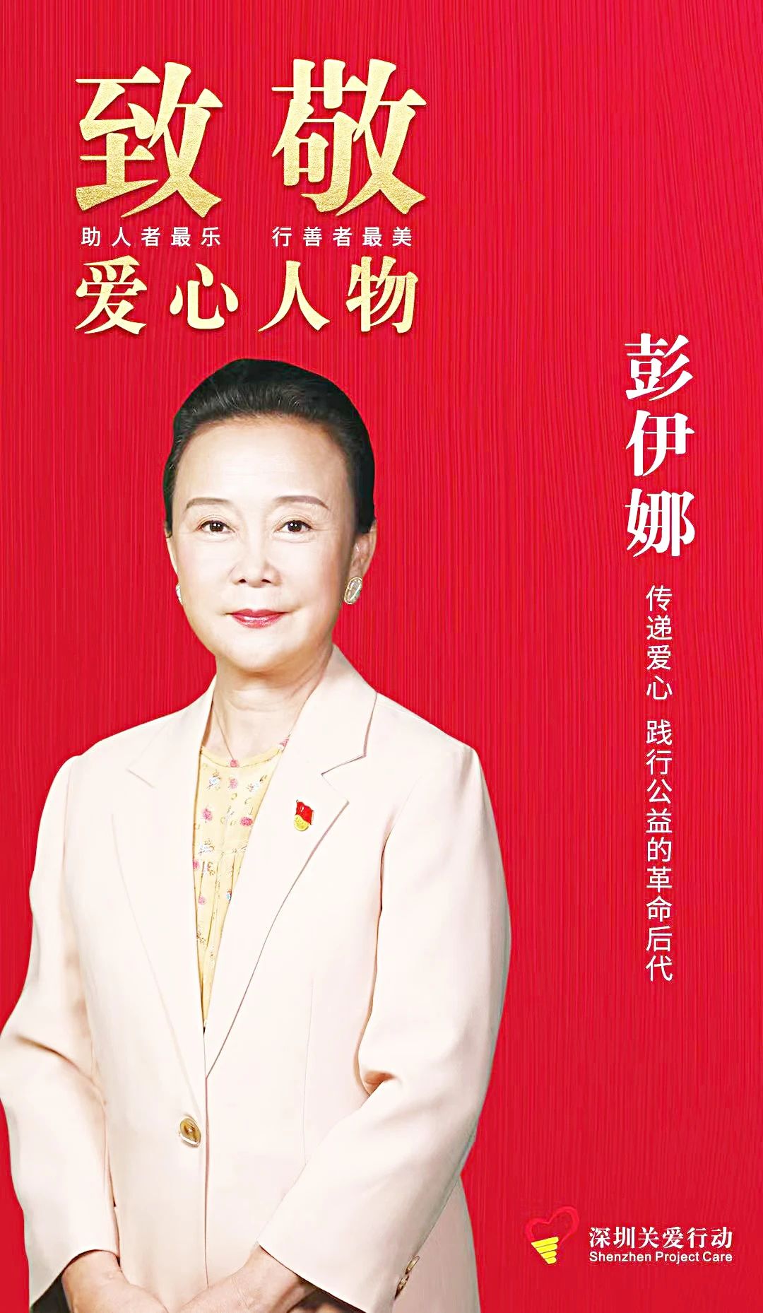 彭伊娜一直以先輩為榜樣,樂于奉獻。促成了深圳“公益金百萬行”的成功開展,在深圳市關愛行動公益基金會率先捐資設立“彭伊娜家庭愛心基金”,兒子兒媳結婚不擺酒卻在登記當天設立了“愛心助學基金”奉獻社會。因為她多方面的公益奉獻,榮獲“深圳市十佳愛心人物”稱號,并兩度在中國公益節(jié)榮獲公益人物獎。