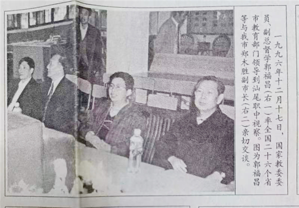 1996年12月17日,時任國家教委委員、副總督學郭福昌(右一)同志帶領全國26個省市教育部門領導,到校視察,時任副市長鄭木勝(右二)陪同視察(資料圖)。