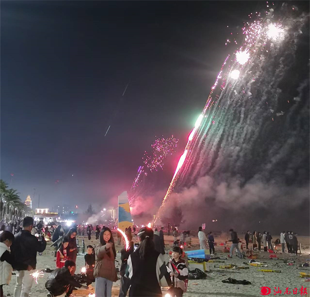 除夕夜,記者在市區春節煙花燃放點市沙灘公園(霞洋白沙灘)看到許多市民游客正燃放煙花喜迎新年,歡笑聲與一聲聲煙花炮響回蕩在除夕夜里,喜慶氛圍十分濃厚。 現場還有公安、消防、街道社區等工作人員在維護秩序,確保各項安全保障措施落實到位。